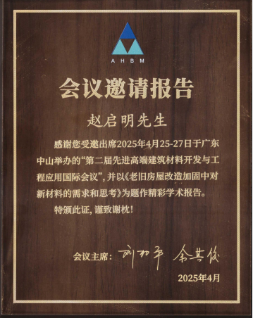 2025 年 4 月 25 - 27 日,第二届先进高端建筑材料开发与工程应用国际会议在广东中山圆满举办。我司副总经理赵启明先生受邀参会,并以《老旧房屋改造加固中对新材料的需求和思考》为题发表精彩学术报告,向全球建材建工领域同仁分享行业实践经验与前沿思考。